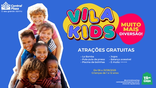 A Vila Kids é um espaço fixo e gratuito voltado para crianças de 1 a 12 anos, com uma ampla variedade de atrações: cama elástica, piscina de bolinhas, jogos interativos, cantinho da leitura, área baby, casa selvagem, pebolim, entre outras atividades.