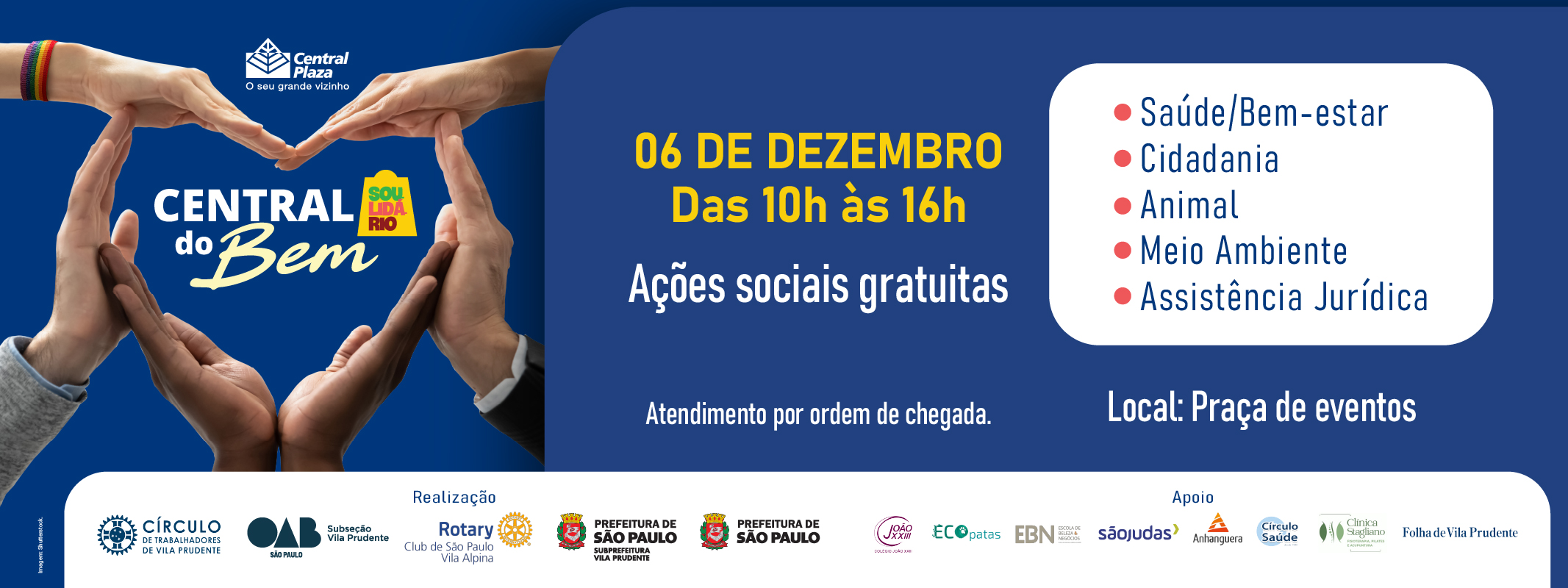 A ação integra a iniciativa SOUlidário, que reúne atividades gratuitas e ações sociais promovidas pelo Central Plaza Shopping. O Central do Bem ainda conta com o apoio de instituições parceiras como Colégio João XXIII, Eco Patas, EBN, Faculdade São Judas, Faculdade Anhanguera, Círculo Saúde, Clínica Stagliano e Folha de Vila Prudente.